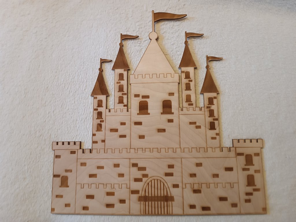 Je vyřezán z 3 mm silné dřevěné překlížky a velmi pečlivě do detailů vygravírován. Standartní velikost je šířka 39 cm a výška v nejvyšším vrcholu 40 cm. Na přání je možné vyrobit hrad i větší nebo menší velikosti. Cena v případě jiné velikosti bude řešena individuálně. Svoje případné požadavky pište na email info@woodness.cz.